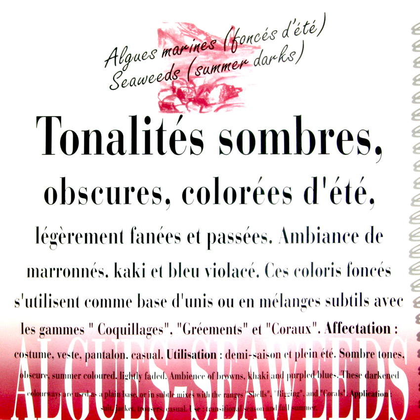 GAMME COULEURS HOMMEPrintemps ETE 1996Laurent Le Tadicpour Yvon Bernard PFD ModomPARTAGER ALGUES MARINEStonalités sombresobscurescolorées dʼété